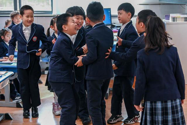 2021年2月22日,上海開學首日,很久不見的盧灣一中心小學的同學們互相擁抱,開心地聊天。澎湃新聞記者 朱偉輝 圖