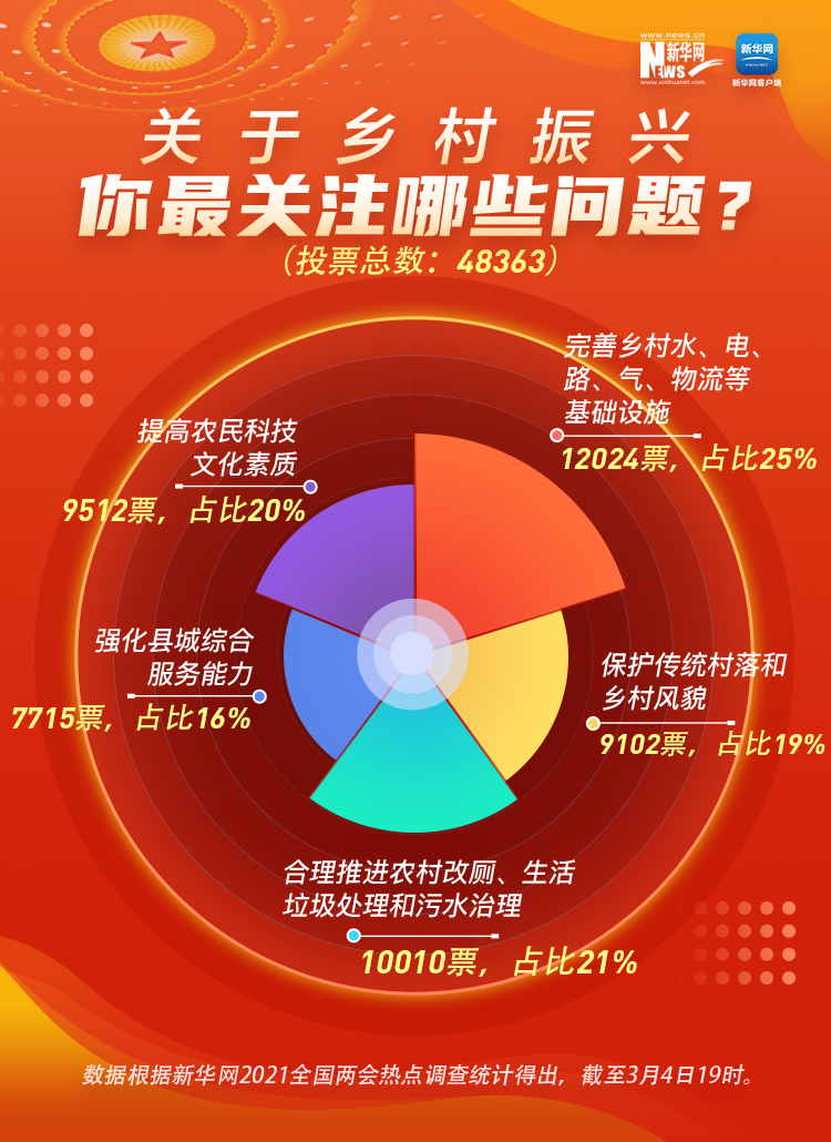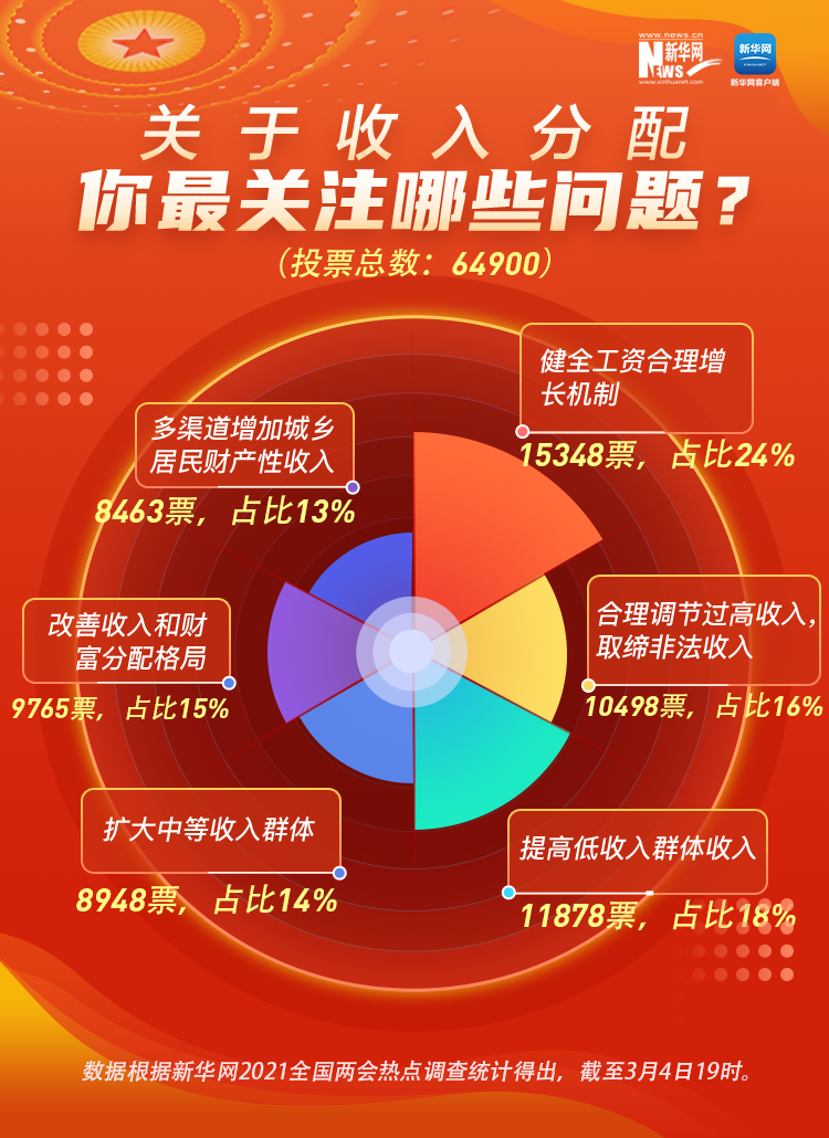 民之所望,政之所向。全國(guó)政協(xié)十三屆四次會(huì)議3月4日在北京開(kāi)幕,2021年全國(guó)兩會(huì)正式開(kāi)啟。今年你最關(guān)心什么事?在新華網(wǎng)前期推出的2021全國(guó)兩會(huì)熱點(diǎn)調(diào)查中,收入分配、鄉(xiāng)村振興、“十四五”規(guī)劃、疫情防控、就業(yè)創(chuàng)業(yè)、養(yǎng)老保障等成為網(wǎng)民關(guān)注的熱點(diǎn)話題。