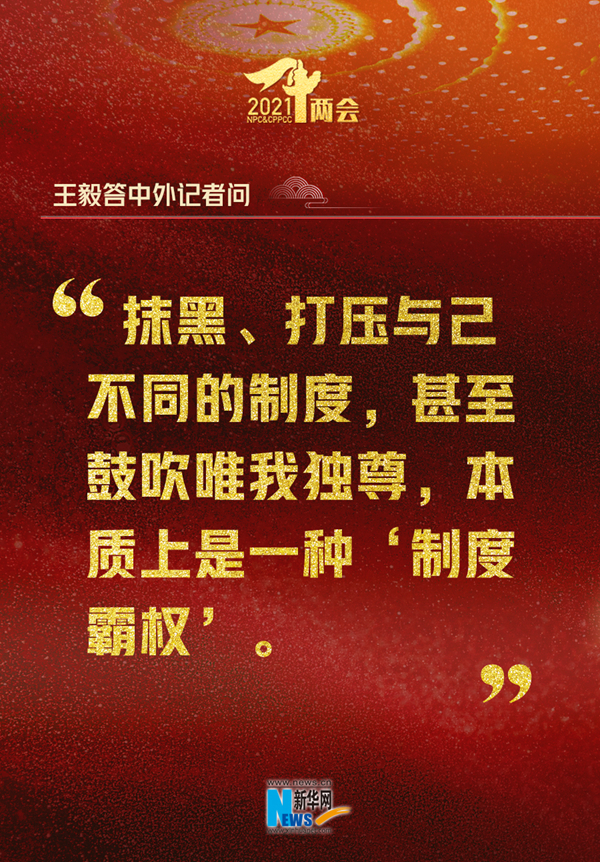 原聲回放:制度的選擇需要量體裁衣,不能削足適履。一個(gè)國(guó)家的路走得對(duì)不對(duì),關(guān)鍵在于是否符合本國(guó)國(guó)情。抹黑、打壓與己不同的制度,甚至鼓吹唯我獨(dú)尊,本質(zhì)上是一種“制度霸權(quán)”。