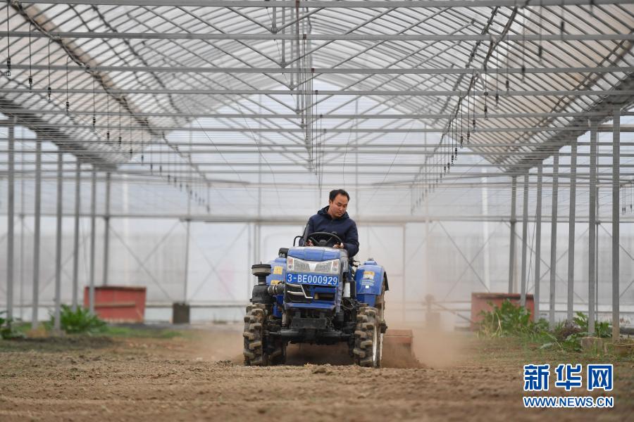3月1日,工人在浙江省湖州市吳興高新區(qū)靈糧農(nóng)場(chǎng)的大棚內(nèi)駕駛旋耕機(jī)進(jìn)行翻耕。 新華社記者 黃宗治 攝