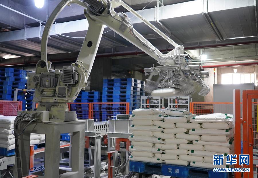 在西安國(guó)際港務(wù)區(qū)愛菊農(nóng)產(chǎn)品物流加工園區(qū)內(nèi),面粉生產(chǎn)線上的機(jī)械臂在碼放包裝好的面粉(2020年4月8日攝)。 新華社記者 邵瑞 攝