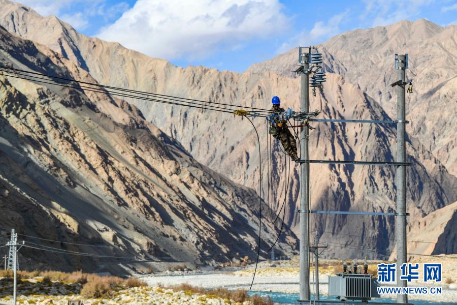 在新疆塔什庫(kù)爾干塔吉克自治縣的深山中,工人在調(diào)節(jié)一處入戶線路的松緊度(2019年11月23日攝)。為了解決供電難題,新疆加大投入,實(shí)施光伏供電村電網(wǎng)延伸工程,惠及偏遠(yuǎn)村莊。 新華社記者 胡虎虎 攝