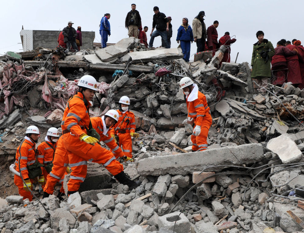 ↓ 圖為2010年4月16日,救援人員在結(jié)古寺賓館進(jìn)行救援。