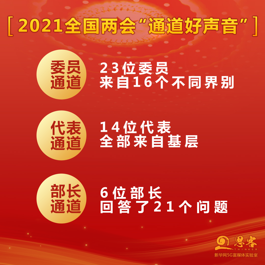 3月11日,2021年全國(guó)兩會(huì)圓滿落下帷幕。會(huì)議期間共舉行了2場(chǎng)“代表通道”、3場(chǎng)“委員通道”、2場(chǎng)“部長(zhǎng)通道”。今年的7場(chǎng)“通道”受到網(wǎng)民留言點(diǎn)贊,“回答很有意思,故事里有深意”“不避熱點(diǎn)難題,回答讓人解渴”“務(wù)實(shí)、誠(chéng)懇、有態(tài)度”“滿滿的自信,中國(guó)未來更給力”……