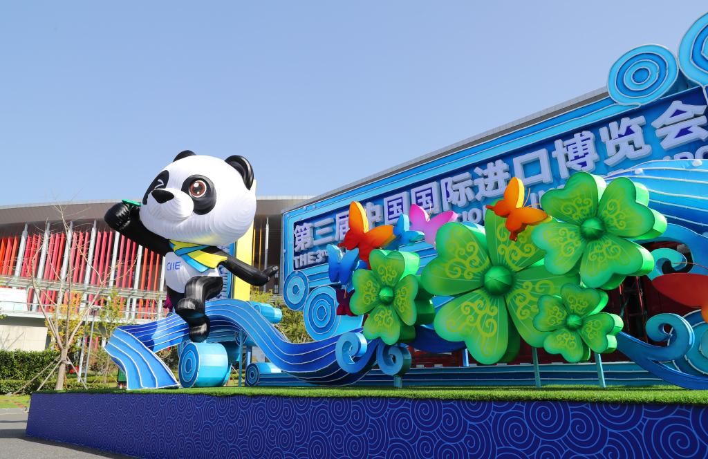 國家會(huì)展中心(上海)西入口處擺放的熊貓“進(jìn)寶”主題進(jìn)博會(huì)裝飾(2020年10月23日攝)。新華社記者 方喆 攝