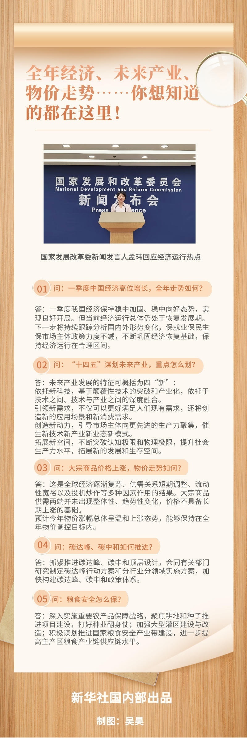 一季度中國(guó)經(jīng)濟(jì)高位增長(zhǎng),全年走勢(shì)如何?“十四五”謀劃未來產(chǎn)業(yè),重點(diǎn)怎么劃?大宗商品價(jià)格上漲,物價(jià)可控嗎?國(guó)家發(fā)展改革委新聞發(fā)言人孟瑋在19日舉行的新聞發(fā)布會(huì)上就熱點(diǎn)問題作出回應(yīng)。