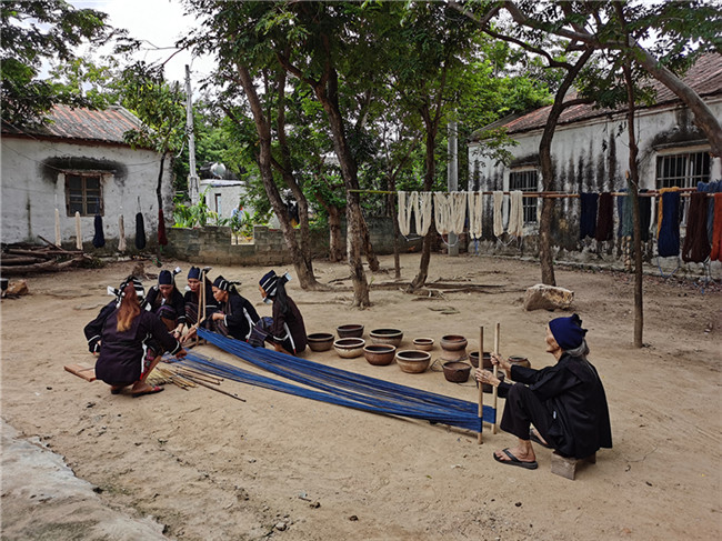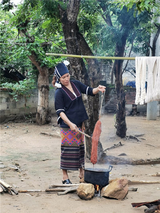 在確定復(fù)制參照物后,馬上組織開始織造工作。龍被技藝恢復(fù)織造過程,前后涉及6支團(tuán)隊(duì),近100人。在數(shù)月的復(fù)制過程中,遇到的困難重重,手工棉紡線的緊缺,植物染色原材料由于季節(jié)天氣、種植不足等因素產(chǎn)生的緊缺,織造設(shè)備的問題,都對(duì)復(fù)制過程產(chǎn)生較大影響,同時(shí)也是技藝恢復(fù)中有待恢復(fù)的重要組成。在織造中,試錯(cuò)的情況也屢屢發(fā)生。“最終,我們克服了所有問題,終于使得龍被紡、染、織、繡技藝得以恢復(fù)。”說起這段過往,郭凱印象深刻。