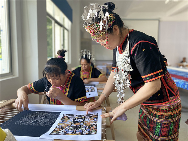 在技藝恢復(fù)的過程中,郭凱的團(tuán)隊(duì)也有意外的收獲。通過對(duì)三聯(lián)幅、五聯(lián)幅龍被的復(fù)制,恢復(fù)傳統(tǒng)龍被織造技藝,對(duì)黎錦傳統(tǒng)技藝的傳承與發(fā)展具有重要意義;通過對(duì)龍被的原材料使用和織造技藝(包括紡染織繡各項(xiàng)技藝)過程編輯形成圖文資料,拍攝形成影像資料,為龍被技藝的保護(hù)、傳承與發(fā)展留下了寶貴的資料和傳播素材;通過開辦龍被刺繡技能培訓(xùn)班,培養(yǎng)了一批刺繡人才,使越來越多的人群能夠掌握傳統(tǒng)特色一技之長,繼而產(chǎn)生富有民族特色的經(jīng)濟(jì)效益和社會(huì)效益,更大程度地傳承民族技藝,并將其發(fā)揚(yáng)光大。