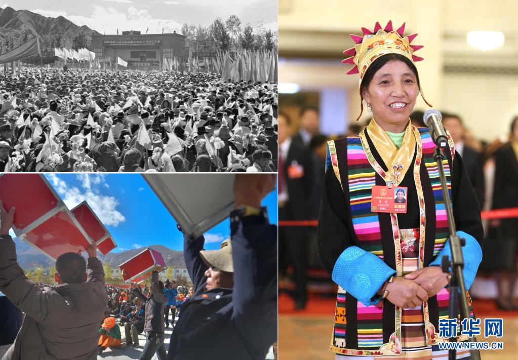 這是一張拼版照片:左上圖為1965年9月9日,拉薩各界各族人民三萬多人舉行集會游行,熱烈慶祝西藏自治區(qū)正式成立(新華社記者馬競秋攝);左下圖為拉薩市柳梧新區(qū)管委會柳梧鄉(xiāng)柳梧村換屆選舉工作人員展示投票箱(2014年10月29日新華社記者普布扎西攝);右圖為2018年3月11日,十三屆全國人大一次會議在北京人民大會堂舉行第三次全體會議,全國人大代表卓嘎在“代表通道”接受采訪(新華社記者金立旺攝)。新華社發(fā)