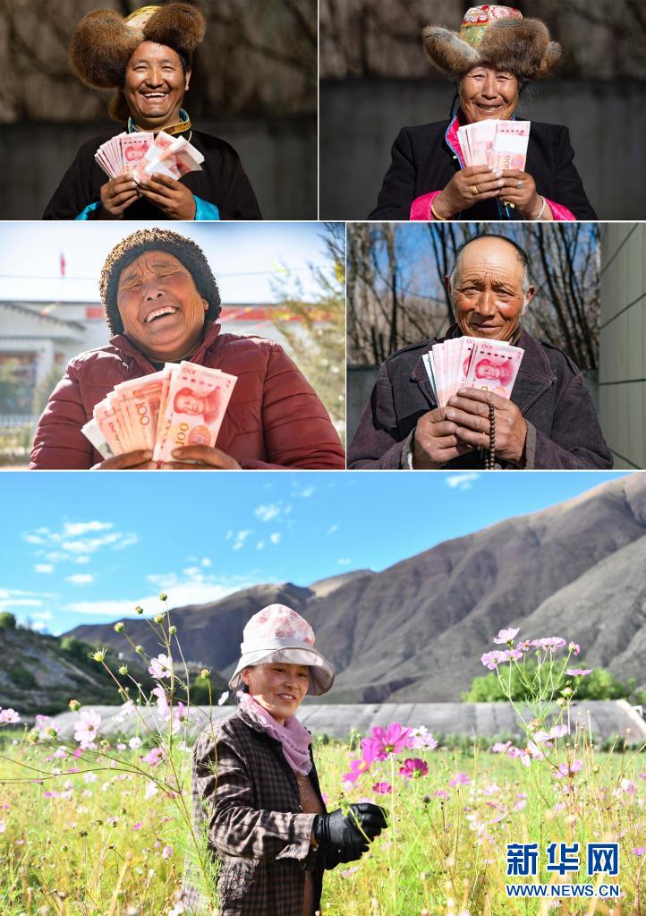 這是一張拼版照片:上四圖為2021年2月9日,山南市乃東區(qū)克松社區(qū)領(lǐng)到分紅的農(nóng)民興高采烈(新華社記者普布扎西攝);下圖為西藏昌都市察雅縣卡貢村村民在當(dāng)?shù)孛缙援a(chǎn)業(yè)基地采集鮮花種子,曾經(jīng)的建檔立卡貧困戶在這里實現(xiàn)了就業(yè),完成了脫貧(2020年9月28日 新華社記者晉美多吉攝)。新華社發(fā)