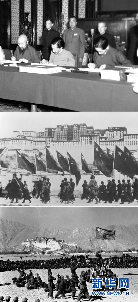 這是一張拼版照片:上圖為1951年5月23日,中央人民政府與西藏地方政府在北京簽訂《關(guān)于和平解放西藏辦法的協(xié)議》(簡稱“十七條協(xié)議”)。上圖為西藏地方政府代表在協(xié)議上簽字;中圖為1951年10月26日,西藏地方政府為人民解放軍舉行了隆重的入城式,拉薩古城飄揚著五星紅旗;下圖為西藏和平解放后,人民解放軍與藏族群眾在布達(dá)拉宮前歡度新年。
