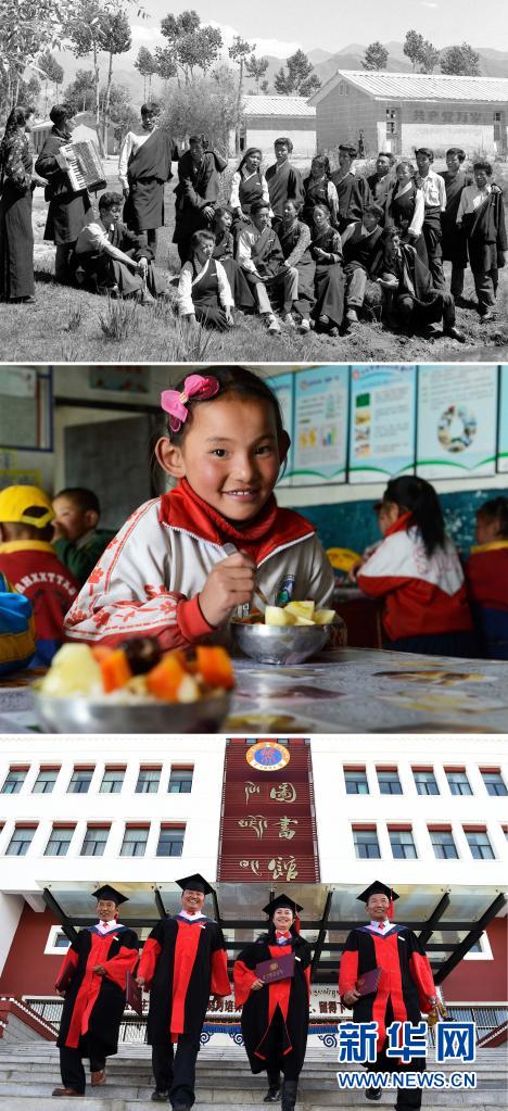 這是一張拼版照片:上圖為拉薩中學(xué)的應(yīng)屆畢業(yè)生在校園里練歌,準(zhǔn)備參加畢業(yè)典禮(新華社記者任用昭攝);中圖為一名藏族女孩在西藏雙湖縣嘎措鄉(xiāng)小學(xué)內(nèi)享受“三包”(包吃、包住、包學(xué)習(xí)費用)政策(2014年6月29日新華社記者普布扎西攝);下圖為2017年11月10日,西藏大學(xué)舉行首屆博士研究生畢業(yè)典禮,向4名畢業(yè)生授予博士學(xué)位。這4名博士分別來自藏族歷史專業(yè)、藏語言文學(xué)專業(yè)及高原醫(yī)學(xué)專業(yè)(新華社記者覺果攝)。新華社發(fā)