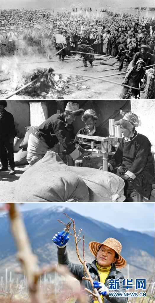 這是一張拼版照片:上圖為1959年8月,西藏墨竹工卡縣的翻身農(nóng)奴焚燒三大領(lǐng)主的剝削文契(新華社發(fā));中圖為1984年,江孜縣農(nóng)民洛桑旺堆(左)向國家出售余糧。他家承包土地100多畝,農(nóng)忙種地,農(nóng)閑搞建筑、跑運輸(新華社記者土登攝);下圖為2020年3月22日,西藏林芝現(xiàn)代蘋果標(biāo)準(zhǔn)化示范園的工作人員為桃樹剪枝。該示范園實施農(nóng)機(jī)農(nóng)藝結(jié)合、水肥一體化及“果草畜循環(huán)”,大面積推廣蘋果矮砧集約高效栽培技術(shù),帶動米林縣羌納鄉(xiāng)林巴、才巴、色沃村及附近的農(nóng)戶增收(新華社記者 張汝鋒 攝)。新華社發(fā)