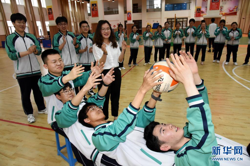 5月23日,青島通濟實驗學校高三學生在進行“躺椅傳球”游戲。新華社記者 李紫恒 攝