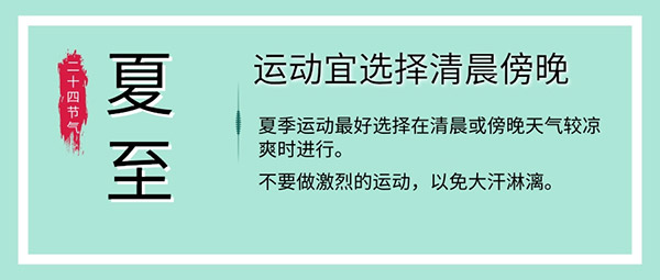 夏季運(yùn)動時間宜在清晨或傍晚,此時天氣涼爽,可以采用健步走、慢跑、太極拳等運(yùn)動緩和的項(xiàng)目進(jìn)行體育鍛煉,宜避開烈日熾熱之時且不宜做過分劇烈的活動,以免汗出太過,損傷陽氣,耗傷陰氣,且運(yùn)動后不可用冷水淋浴或沖頭。