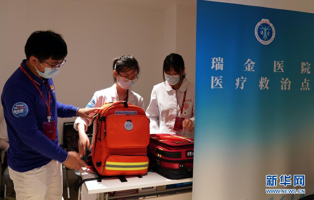 上海交通大學(xué)醫(yī)學(xué)院附屬瑞金醫(yī)院的醫(yī)護(hù)人員擔(dān)當(dāng)志愿者,在中共一大紀(jì)念館設(shè)立醫(yī)療救治點(diǎn),提供醫(yī)療保障任務(wù)(7月11日攝)。新華社記者 劉穎 攝