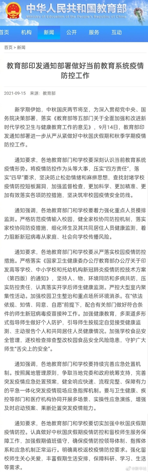 記者15日從教育部獲悉,教育部日前印發(fā)通知部署進一步從嚴從緊做好中秋國慶假期和秋季學期疫情防控工作。通知要求,各地教育部門和學校要將疫情防控作為頭等大事,查找封堵學校疫情防控短板漏洞,健全家校協(xié)同防控機制,細化師生及其共同居住人員健康監(jiān)測,著力阻斷新冠病毒從家庭、社會向?qū)W校傳播風險。通知要求,各地教育部門和學校要做好中秋國慶假期疫情防控和留校師生服務保障工作,加強假期值班值守,確保疫情防控領(lǐng)導體制、指揮體系和應急機制正常運行。(記者余俊杰)