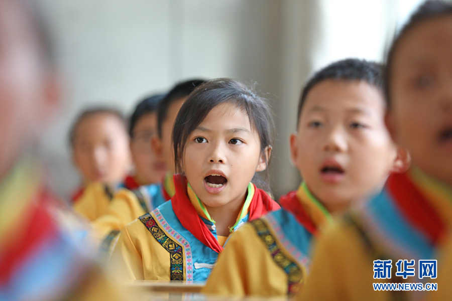 課堂上,彭水自治縣鞍子鎮(zhèn)小學(xué)4年級1班孩子們正跟著任茂淑一起傳唱苗族民歌。新華網(wǎng)發(fā)(趙勇 攝)