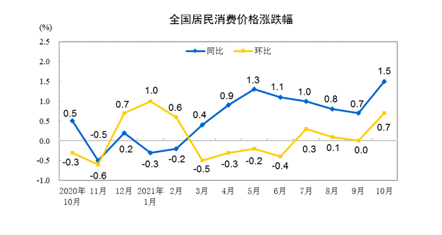 國家統(tǒng)計局10日發(fā)布數據,10月份,全國居民消費價格指數(CPI)同比上漲1.5%,漲幅雖比上月擴大0.8個百分點,但仍低于宏觀調控預期目標,消費市場供需基本平穩(wěn)。