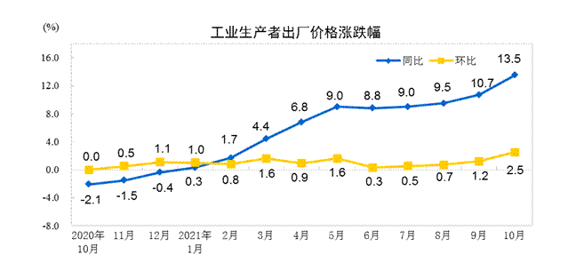 專家分析,部分食品和工業(yè)消費品價格漲幅擴大,顯示大宗商品價格上漲壓力正向部分終端消費品傳導。據統(tǒng)計,受國際輸入性因素疊加國內主要能源和原材料供應偏緊影響,10月份,全國工業(yè)生產者出廠價格指數(PPI)同比上漲13.5%,漲幅比上月擴大2.8個百分點。