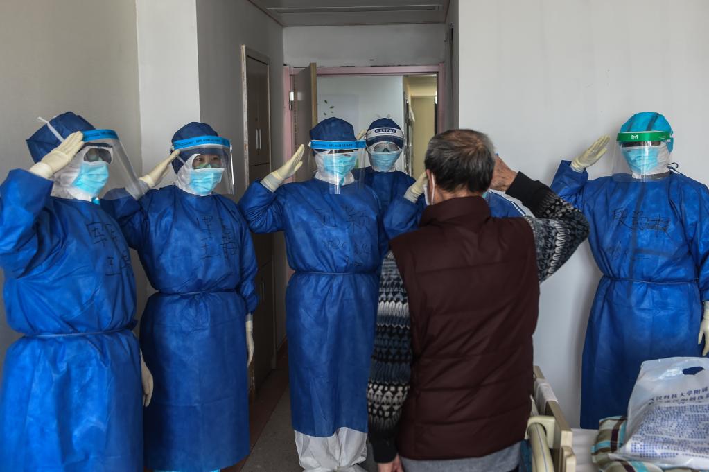 在中國(guó)湖北省婦幼保健院光谷院區(qū),一名即將出院的老年患者向醫(yī)護(hù)人員致敬(2020年3月14日攝)。新華社發(fā)(趙佳慶攝)