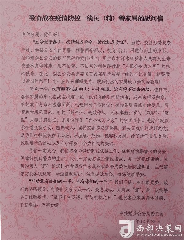 西部決策網(wǎng)訊為表達(dá)對奮戰(zhàn)在疫情防控一線民輔警家屬的崇高敬意,感謝他們對公安工作的理解和支持,12月29日下午,勉縣公安局組織開展疫情防控一線民輔警家屬慰問活動,為家屬們送去慰問信和慰問品,并通過他們向奮戰(zhàn)在一線的民輔警傳遞勉縣公安局黨委的溫暖和關(guān)愛,以更加飽滿的熱情、昂揚(yáng)的斗志投入到疫情防控工作中。