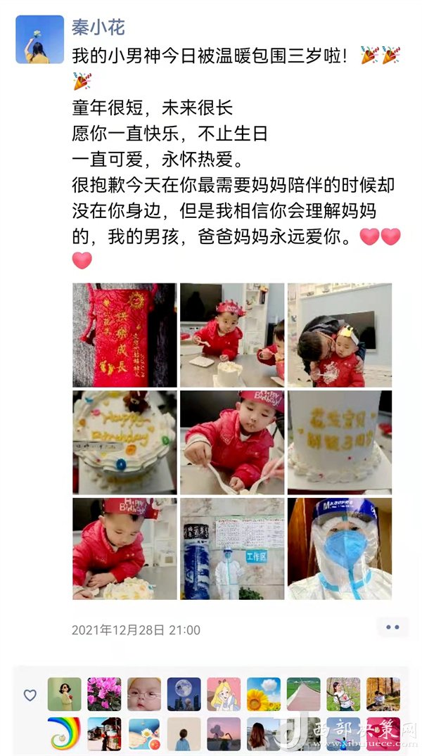 12月28日,是她兒子三歲生日,兒子生病時,她在西安支援。如今,兒子生日,她又在隔離點,她把對兒子的愧疚之心轉(zhuǎn)化為對隔離群眾的關(guān)愛之心。