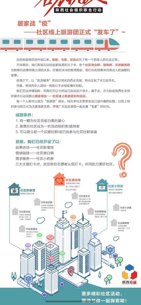針對目前疫情防控形式,進一步調動激發(fā)社區(qū)內生力量動員社區(qū)自組織、志愿服務隊等團體力量,合力抗疫陜西社會組織聯(lián)合行動倡議志愿者在社區(qū)開展“家門口的志愿服務”社區(qū)實踐,引導有條件的居民自助互助。