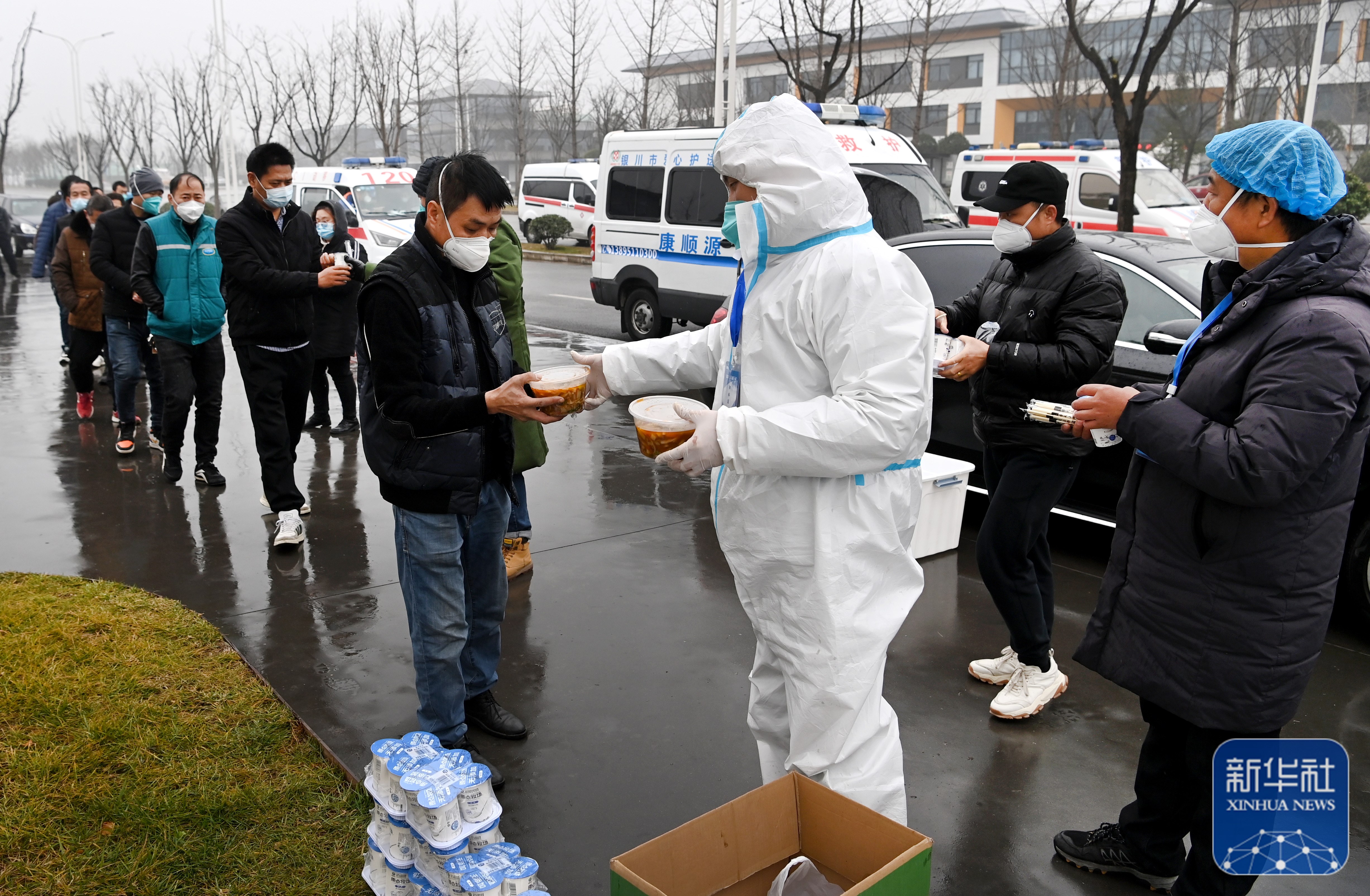1月8日,志愿者(右三)在為防疫一線(xiàn)人員發(fā)放“愛(ài)心餐”。