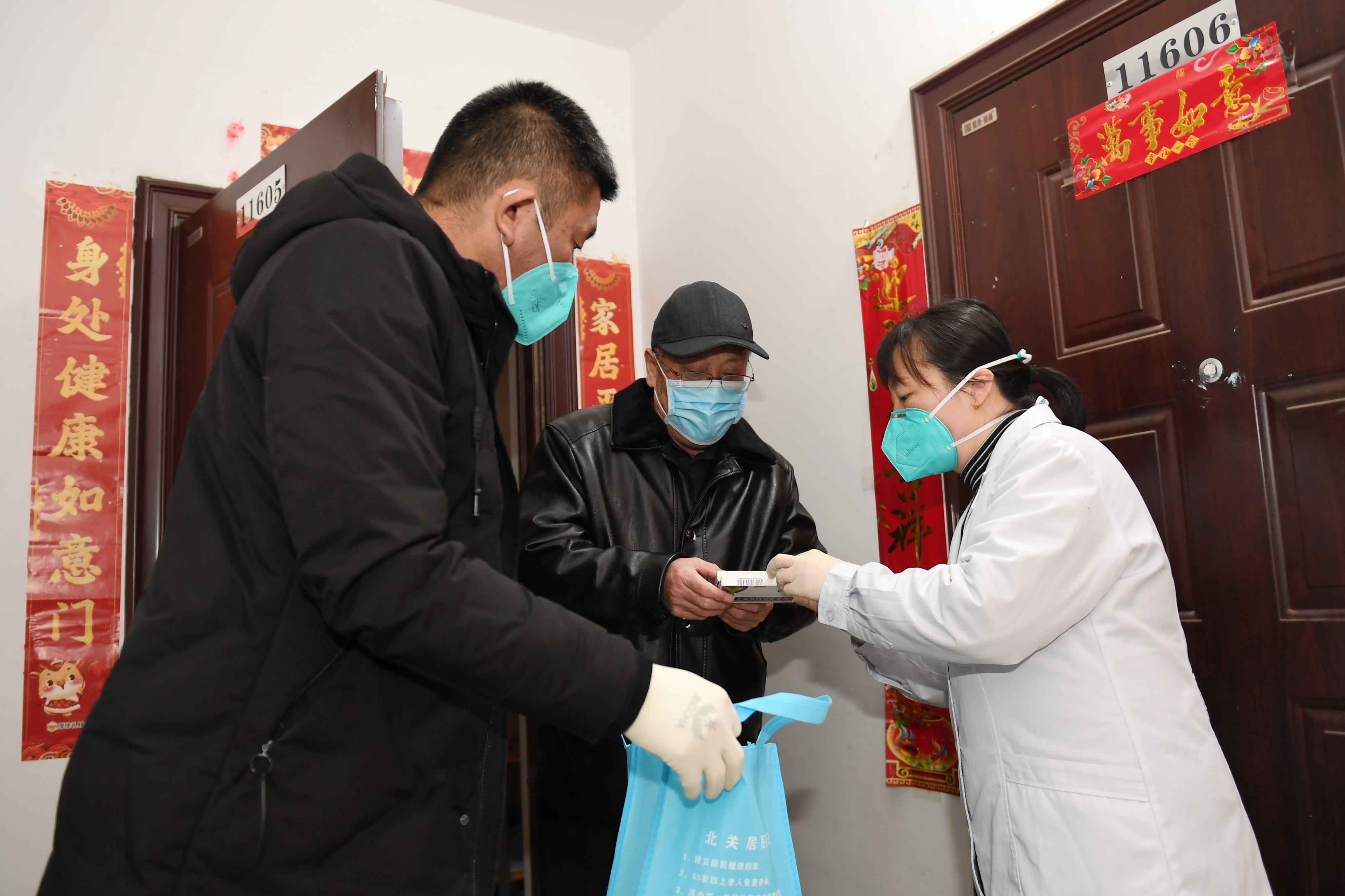 1月8日,在西安秦地雅仕小區(qū),蓮湖區(qū)北關(guān)社區(qū)衛(wèi)生服務(wù)中心檢驗(yàn)師韓涼(右)為電話就醫(yī)的患者送藥上門。新華社記者 李一博 攝