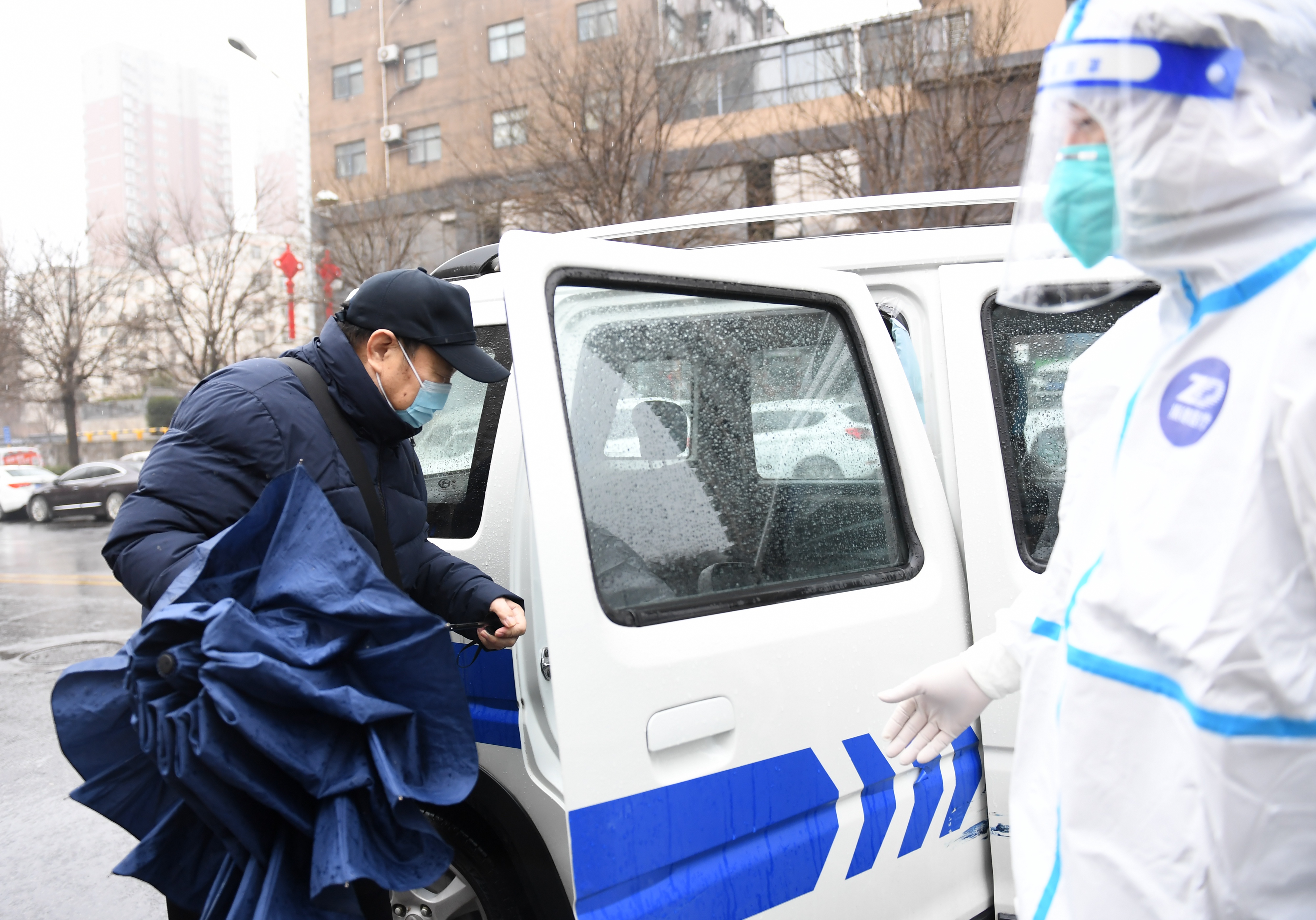 1月8日,在西安市蓮湖區(qū)上和城小區(qū),龍首西南社區(qū)安排專車接送患病居民(左)前往西安市中醫(yī)醫(yī)院就醫(yī)。新華社記者 李一博 攝