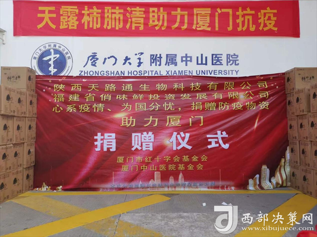 而這也并不是“天露柿肺清”口服液第一次出現(xiàn)在抗疫第一線。早在2021年9月29日,陜西天路通生物科技有限公司就為廈門中山醫(yī)院捐獻過一批抗疫物資,捐贈了價值20多萬“天露柿肺清”口服液作為抗疫物資,支援中山醫(yī)院的一線醫(yī)護人員們,助力廈門抗疫。當時正值廈門中山醫(yī)院抗擊新冠肺炎疫情的緊要關頭,天路通生物科技有限公司及時伸出援助之手,無償捐贈抗疫物資,為打贏疫情防控阻擊戰(zhàn)增強了信心和力量。病毒無情,八方友愛,仁者愛人,彰顯出企業(yè)的愛國情懷和社會責任,展現(xiàn)了人間大愛,脈脈溫情。
