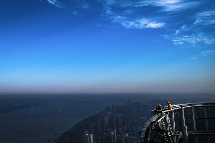 中建三局二公司工人在武漢綠地中心項目建設現場近500米的高空施工。新華社記者肖藝九 攝