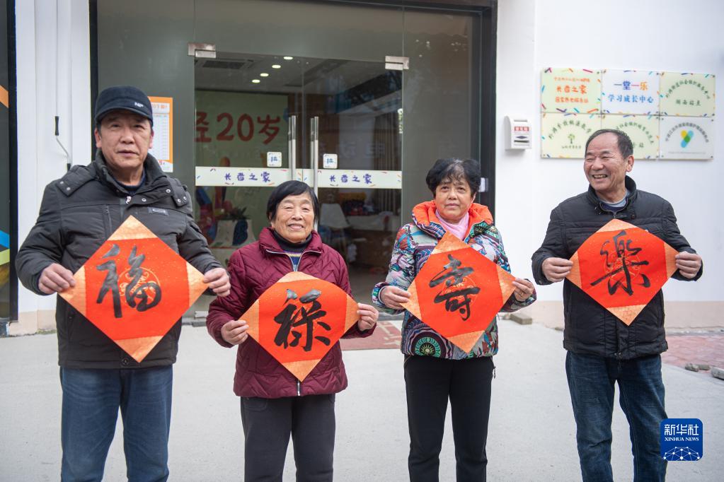 1月18日,江北區(qū)桃源小區(qū)的居民拿著寫好的字在“長(zhǎng)者之家”門口合影。該小區(qū)老年人居住比例較高,在老舊小區(qū)改造過(guò)程中,街道將小區(qū)內(nèi)閑置用房改造成集老年大學(xué)、幼兒托管等為一體的“長(zhǎng)者之家”。新華社記者 江漢 攝