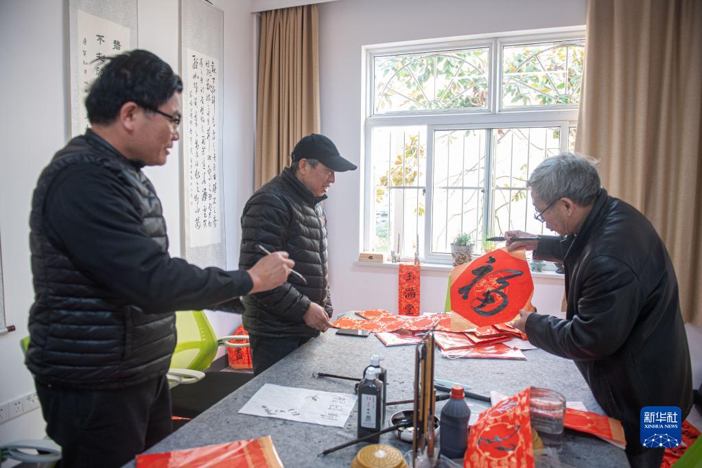 1月18日,江北區(qū)桃源小區(qū)的居民在“長(zhǎng)者之家”寫“福”字。該小區(qū)老年人居住比例較高,在老舊小區(qū)改造過(guò)程中,街道將小區(qū)內(nèi)閑置用房改造成集老年大學(xué)、幼兒托管等為一體的“長(zhǎng)者之家”。新華社記者 江漢 攝
