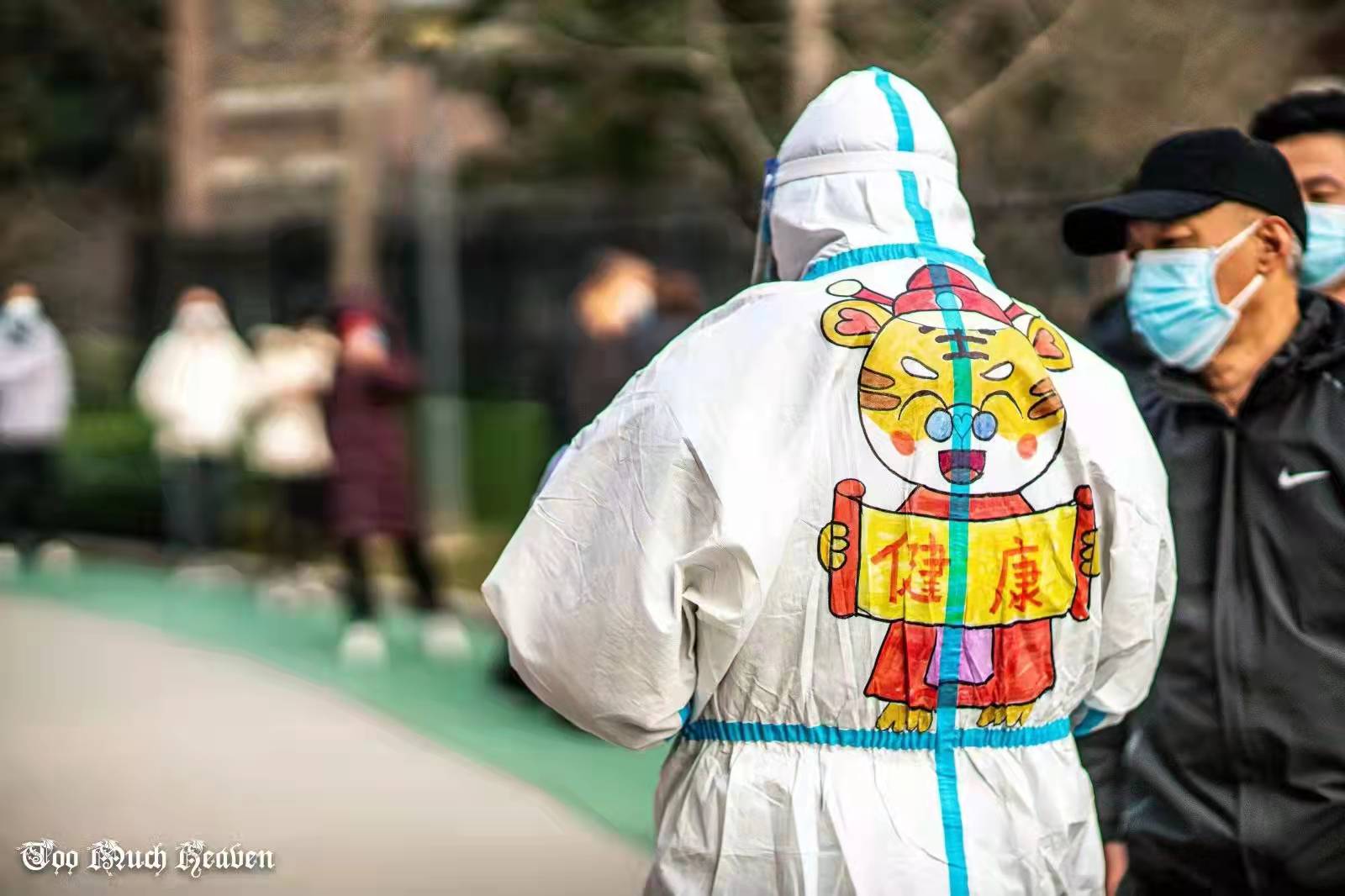 憨態(tài)可掬的小老虎,有的瞇縫著眼睛,有的張開嘴巴,有的捧著鞭炮,有的打著燈籠,還有的雙手捧“福”到家……這些五彩繽紛的圖案,出現(xiàn)在雁塔區(qū)杜城街道中鐵尚都城社區(qū)一批志愿者的防護(hù)服上,引人注目。
