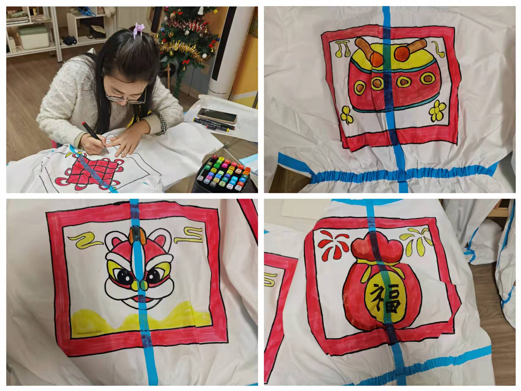 然而,令他們沒想到的是,“在防護(hù)服上作畫,有點(diǎn)難。”吳捷介紹,防護(hù)服的表面材質(zhì)是皺的,需要一手鋪平、另一手用馬克筆畫,“一幅畫畫下來,需要一個多小時。”這樣,他們熬了一個通宵,才完成了13幅作品。