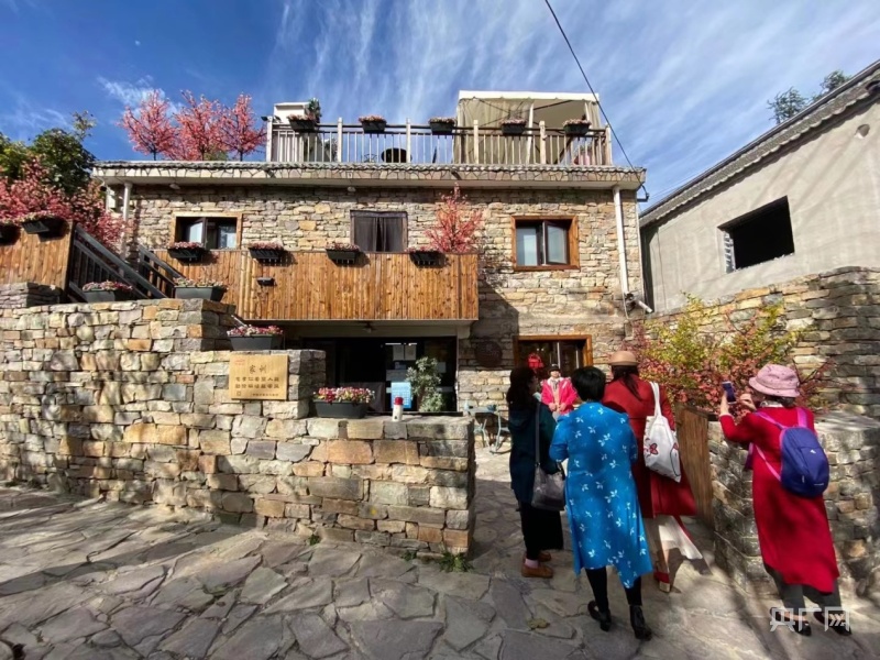 游客們在西井峪一民宿前拍照留念(央廣網(wǎng)記者 褚夫晴 攝)