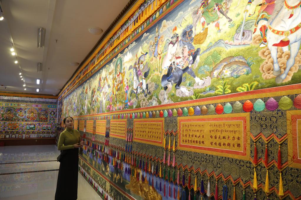 平滑的線條、細(xì)膩的針腳、傳統(tǒng)的繡法、新穎的設(shè)計(jì)……繡坊內(nèi),繡娘們聚精會(huì)神穿針引線,拉毛葉忠仔細(xì)檢查繡娘們的作品,用藏繡技藝講述格薩爾王的故事是一次創(chuàng)新。