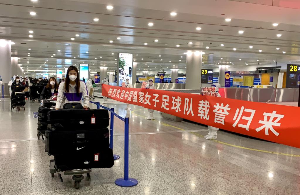2月7日,中國女足隊員抵達(dá)上海浦東國際機場。新華社發(fā)(中國東方航空供圖)