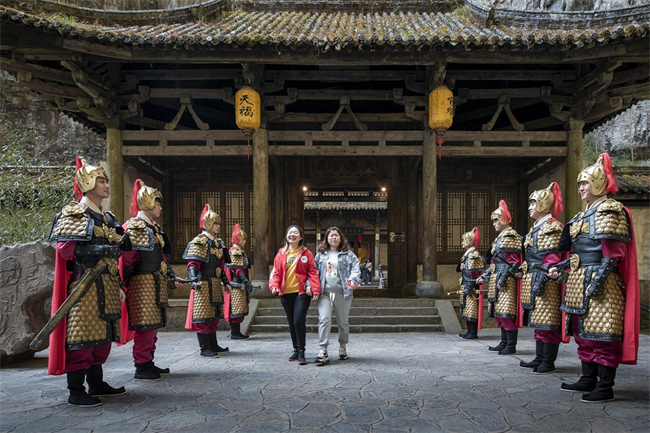 “女王駕到”“恭迎女王陛下”“諸位請起,游玩到此,觀景甚美,諸位與我,共享此景。”在天生三橋景區(qū)天福官驛客棧,一群身形魁梧的帶刀侍衛(wèi),整齊的站在驛站門口兩側(cè)恭迎每位入園的“女王”?,F(xiàn)場儀式感爆棚,一身金黃的“女王”霸氣外露。驛站內(nèi)熱鬧的氛圍吸引了眾多游客參與,有的上前與侍衛(wèi)互動拍照,有的主動穿上“女王”服體驗霸氣女王范,有的還主動表演起了電影里女王翻牌的有趣橋段。“今天我最大,這樣過節(jié)著實過癮”玩得正起勁的劉女士表示,這是她過得最好玩、最具儀式感的女王節(jié)。