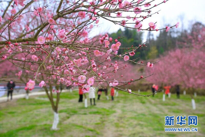 圖為湖北省來(lái)鳳縣革勒車(chē)鎮(zhèn)正南梅園梅花盛開(kāi),吸引不少前來(lái)游玩,為當(dāng)?shù)卮迕裨黾恿耸杖搿?/p>