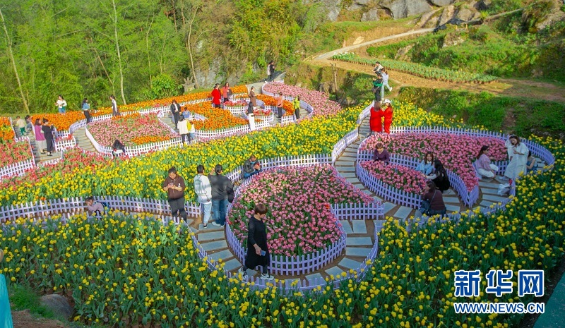 圖為在湖北來(lái)鳳縣檀木灣村萬(wàn)余株郁金香競(jìng)相綻放,吸引游客前來(lái)踏春賞花,“花海經(jīng)濟(jì)”助力村民增收致富。