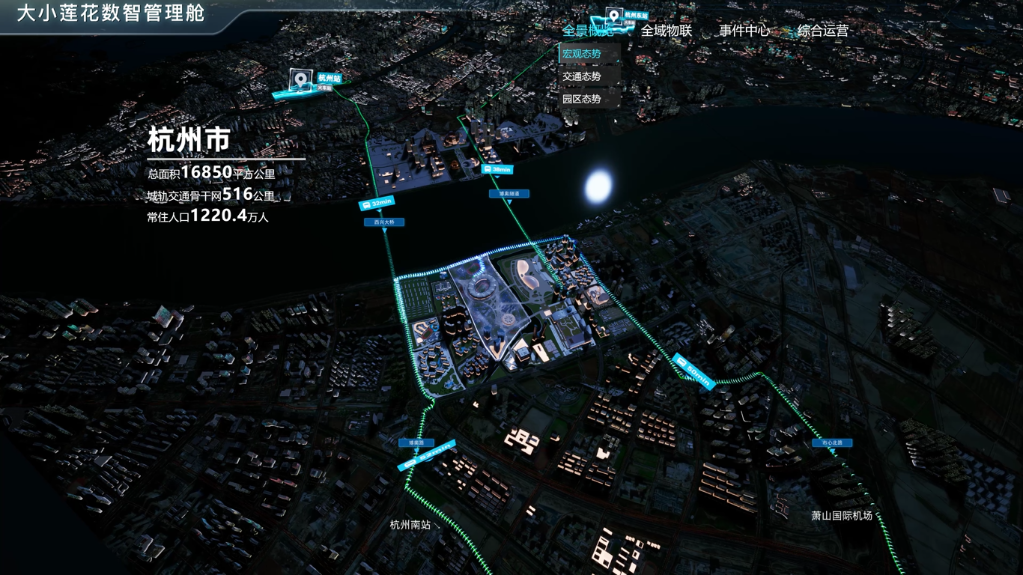 “這是‘大小蓮花’智慧大腦的核心部分,真正實現(xiàn)了一個屏掌控全局。”負責(zé)“大小蓮花”場館運營的阿里體育數(shù)字化服務(wù)中心總經(jīng)理周堡英介紹說,數(shù)智管理艙運用“數(shù)字孿生”技術(shù),將“大小蓮花”高精度核心模型區(qū)與奧體園區(qū)程序化模型區(qū)進行融合,形成與真實世界地理坐標(biāo)系完全一致的奧體中心“數(shù)字孿生基座”。