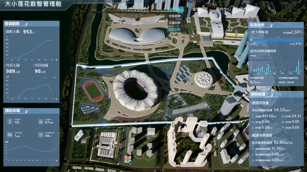 據(jù)悉,數(shù)智管理艙鏈接了整個“大小蓮花”區(qū)域內(nèi)的50個弱電系統(tǒng)、2萬多個設(shè)備、8萬多個設(shè)備單元,可以實現(xiàn)對場館區(qū)域內(nèi)的水、電、氣等實時能耗的監(jiān)測,還可以統(tǒng)計二氧化碳、碳排放量等。