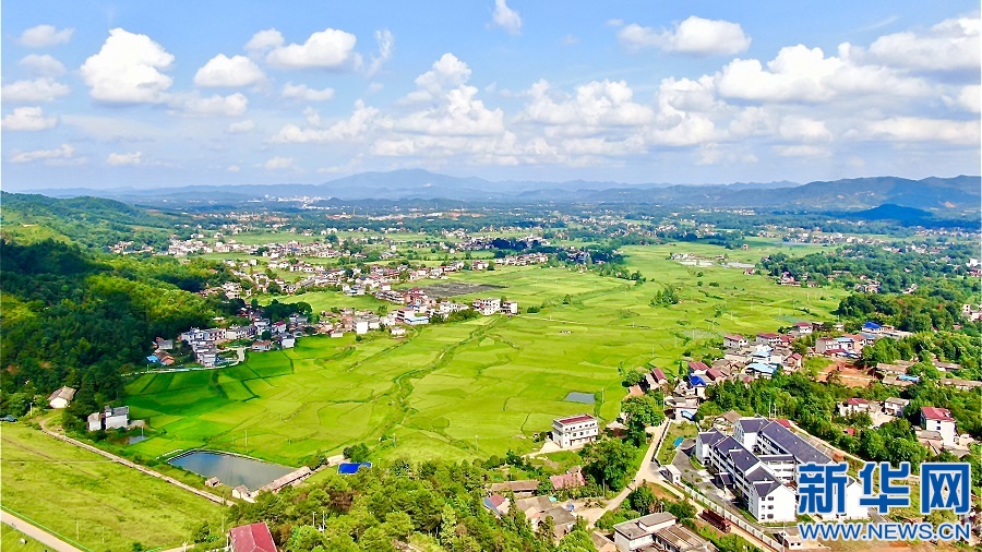 在江西省宜春市袁州區(qū)慈化鎮(zhèn)模山村,高標(biāo)準(zhǔn)農(nóng)田內(nèi)水網(wǎng)縱橫交錯(cuò),與村落、遠(yuǎn)山形成一幅美麗動(dòng)人的鄉(xiāng)村畫(huà)卷。新華網(wǎng)發(fā) 劉卿 攝