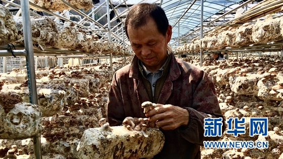 吉祥寺村村民余賢剛在采摘香菇。 新華網(wǎng)發(fā) 胡誠攝