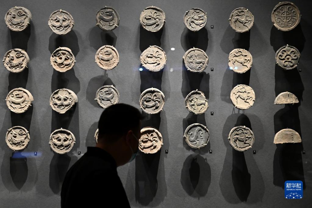4月28日,游客在陜西考古博物館內(nèi)參觀寶雞周原遺址出土的銅輪牙馬車車飾。新華社記者 李一博 攝