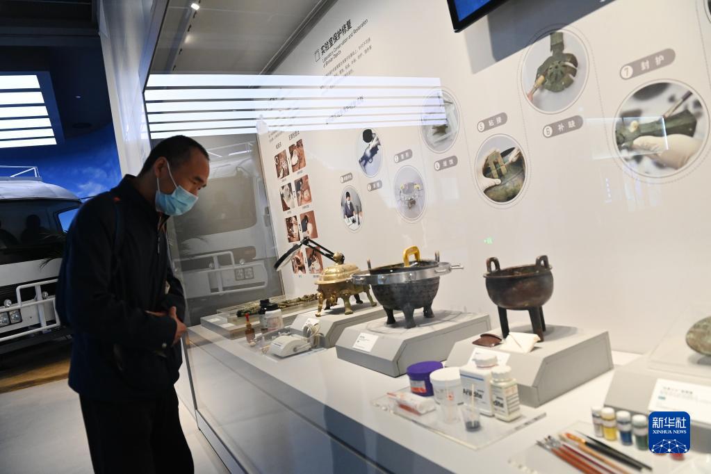 4月28日,游客在陜西考古博物館內(nèi)了解文物的實(shí)驗(yàn)室保護(hù)修復(fù)。新華社記者 李一博 攝