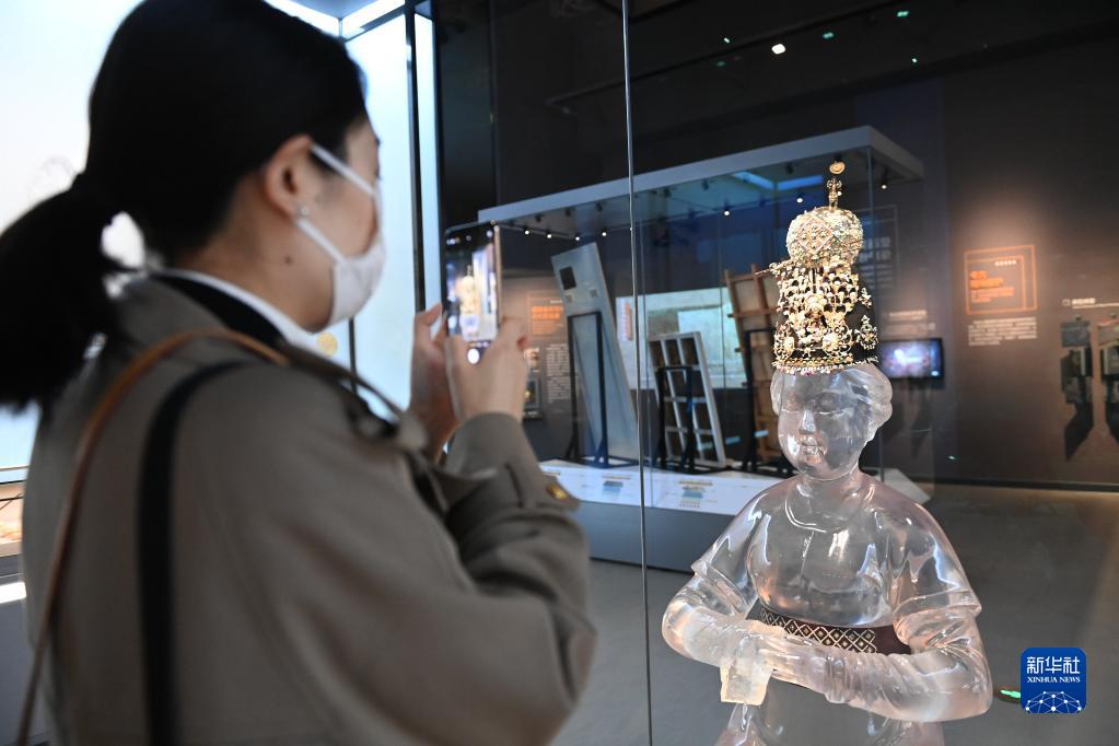 4月28日,游客在陜西考古博物館內(nèi)拍攝唐代李倕冠飾。新華社記者 李一博 攝